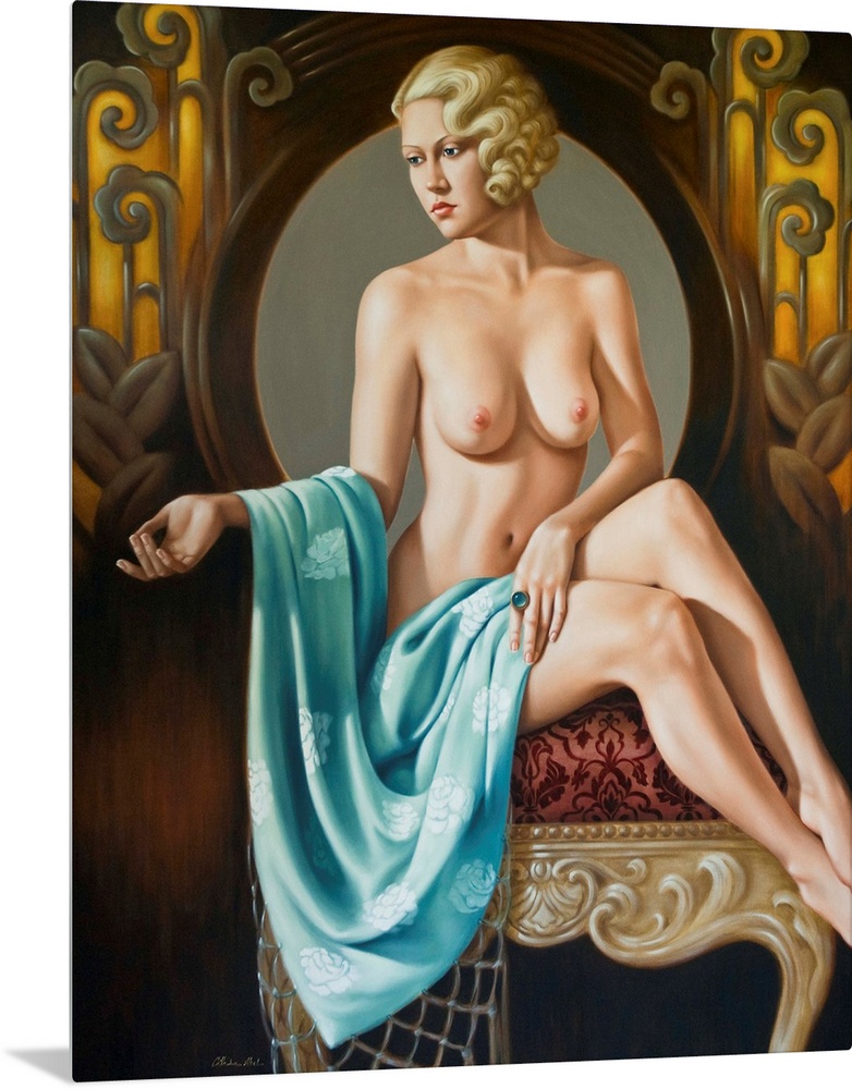 <p>Contemporary painting of a nude woman with a blue shawl.</p>