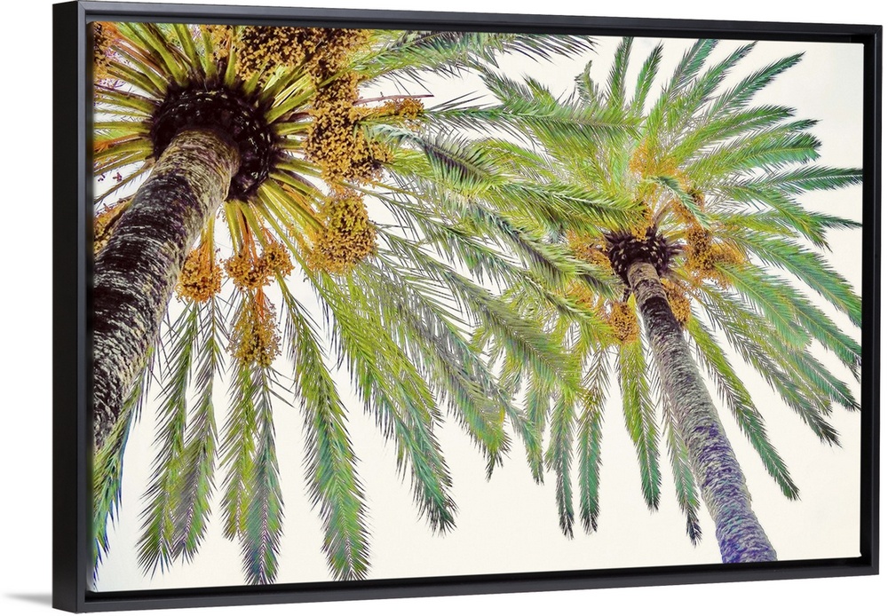 <p>View from below of the tops of two palm trees with leafy fronds.</p>
