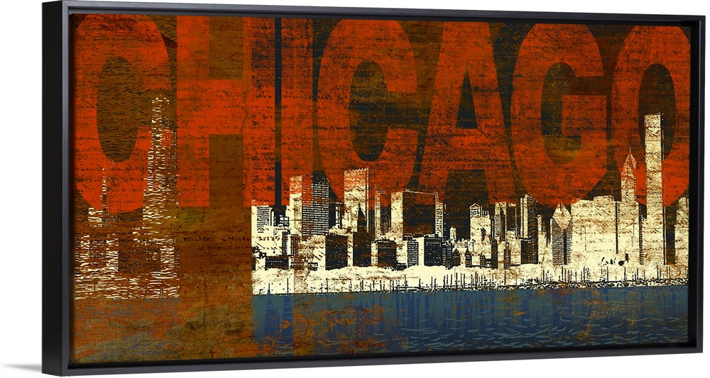 <p>Panoramic abstract painting of a cityscape on a waterfront with large text in the sky on a grungy background.</p>