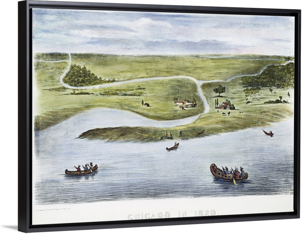 <p>Chicago, 1820. Chicago As It Looked In 1820, With Jean Baptiste Pointe Du Sable's Somewhat Improved Cabin On the Right. Lithograph, American, C1857.</p>