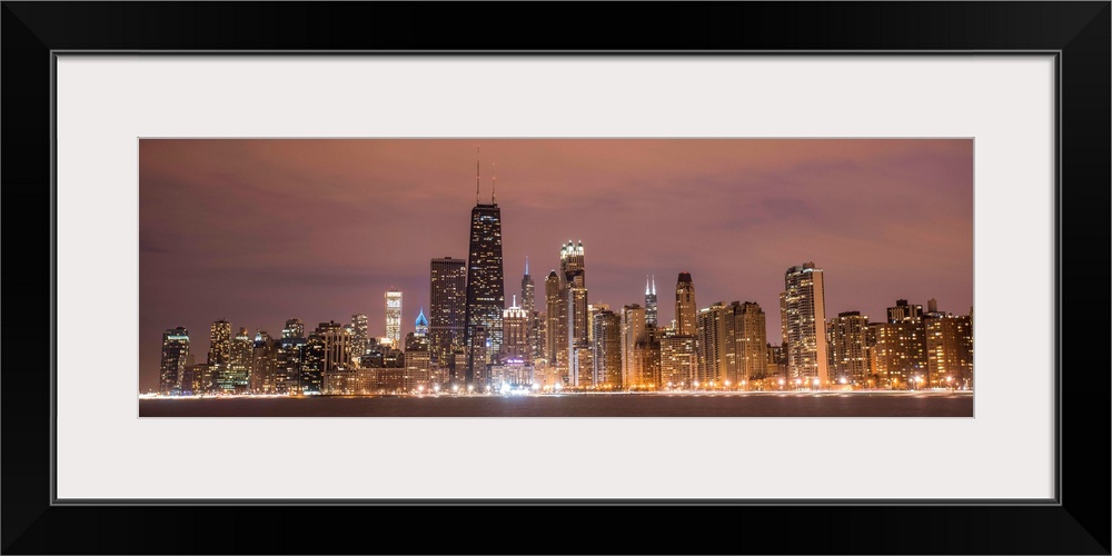 <p>Panoramic view of the Chicago city skyline illuminated in the early evening, seen from across the water.</p>