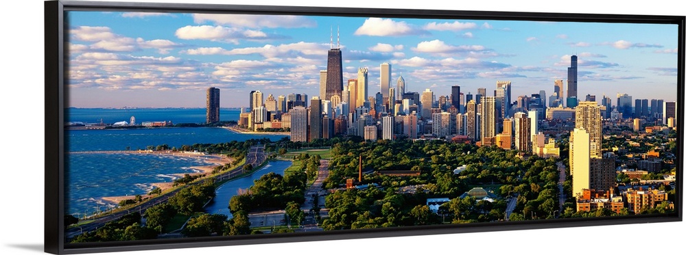 <p>Panoramic photograph taken of the busy skyline of Chicago, Illinois on a sunny day. The skyscrapers in the background are contrasted by the vast amount of trees in the foreground and Lake Michigan located on the left.</p>
