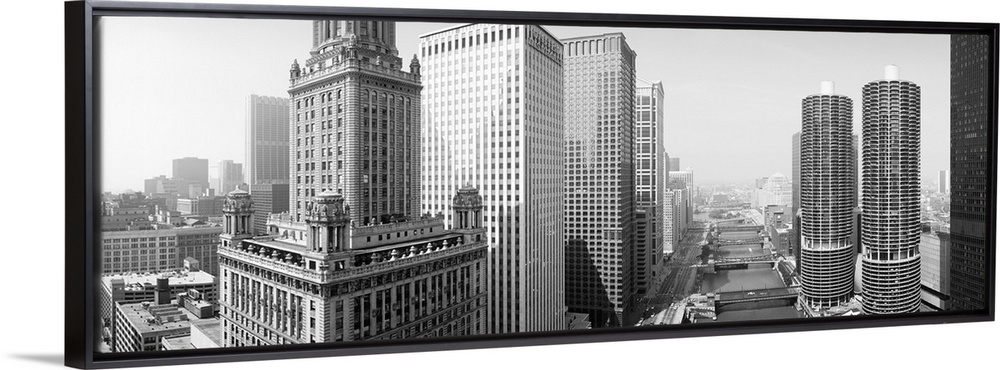 <p>Huge monochromatic photograph taken from an aerial view looks down a river encased by tall skyscrapers within the largest city of Illinois. The various buildings of this city can be seen extending towards the horizon.</p>