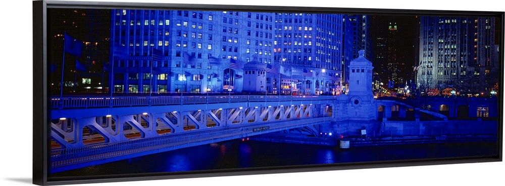 <p>Panoramic view of the Michigan Avenue Bridge during the night. The buildings in the background and the bridge are lit up.</p>
