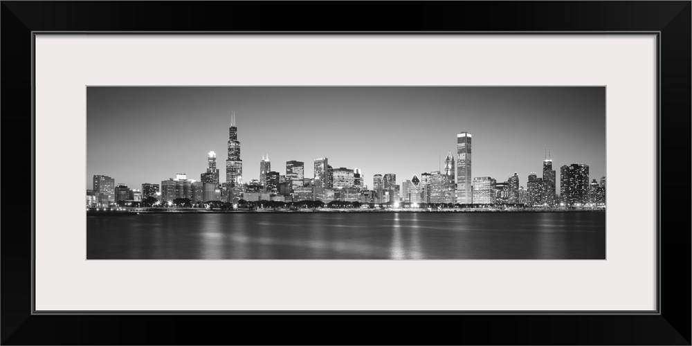 <p>Panoramic monochromatic photograph showcases the busy skyline of a famous city within the Midwestern United States. The blurred reflections of the bright lights from the skyscrapers can be seen reflecting into the river in the foreground.</p>