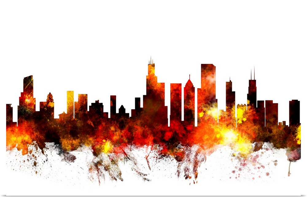 <p>Contemporary piece of artwork of the Chicago skyline made of colorful paint splashes.</p>