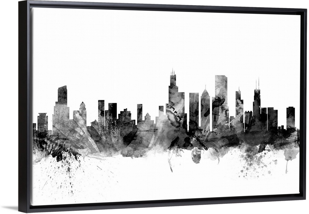 <p>Contemporary artwork of the Chicago city skyline in black watercolor paint splashes.</p>