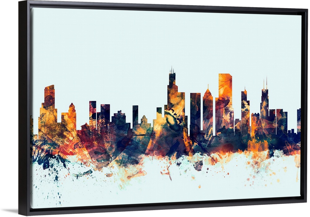 <p>Dark watercolor silhouette of the Chicago city skyline against a light blue background.</p>
