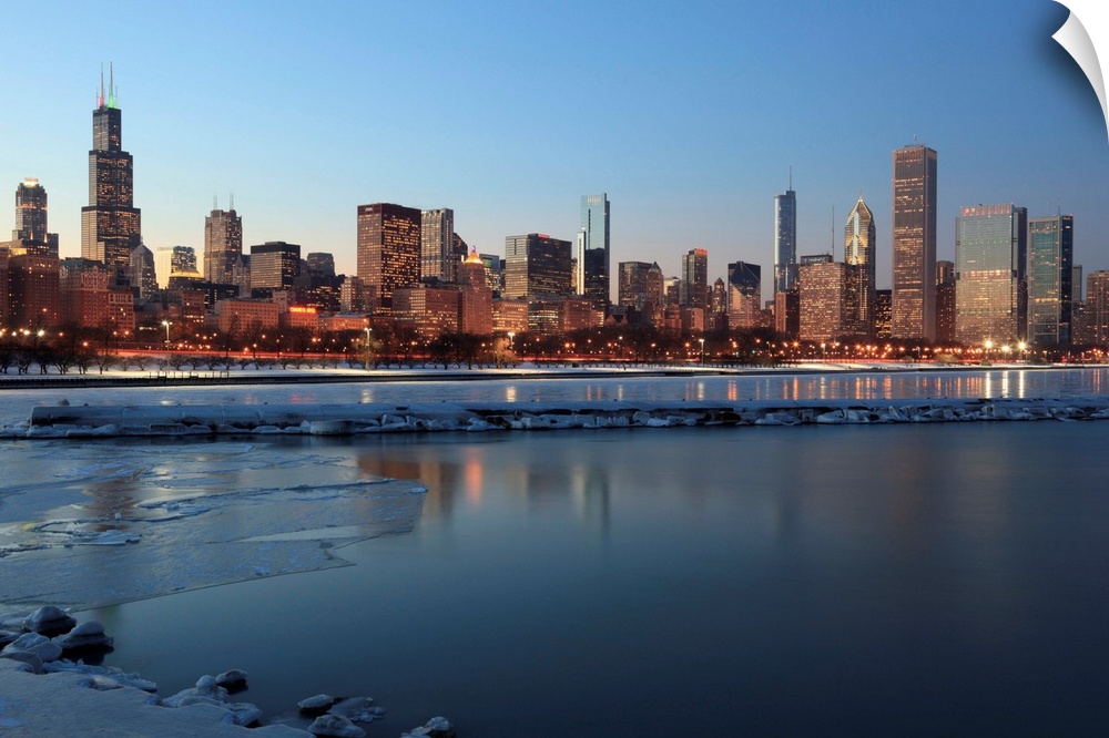 <p>Chicago, Illinois skyline across a frozen Lake Michigan</p>