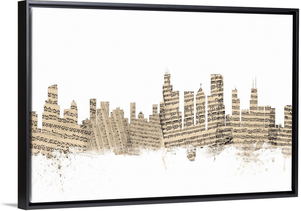 <p>Chicago skyline made of sheet music against a white background.</p>