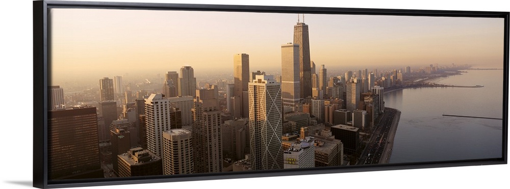 <p>High angle panoramic photograph taken of the skyscrapers in Chicago during sunrise with the lake pictured just to the right.</p>