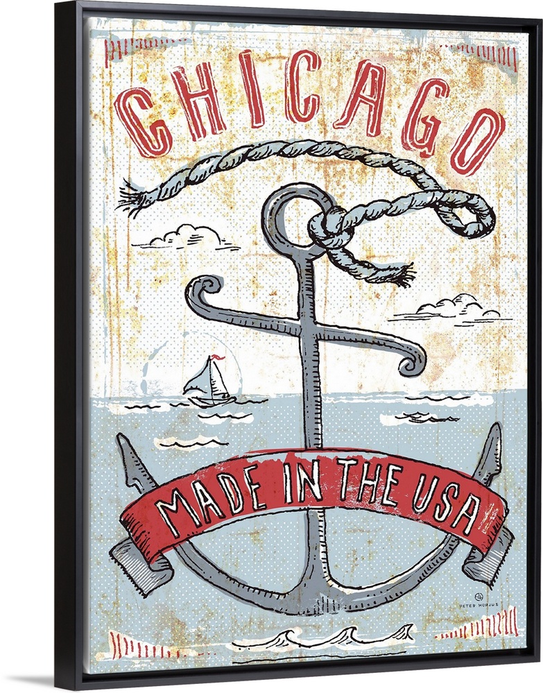 <p>Illustrated vintage, worn, and rusty artwork of Chicago's seaport harbor, with an anchor and a ribbon that says made in the USA.</p>