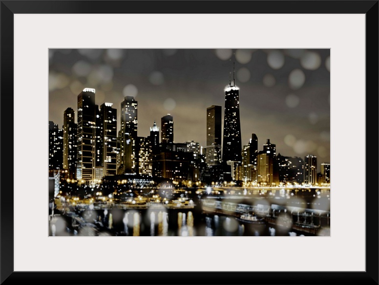 <p>The Chicago skyline lit up at night with the harbor and bokeh lights in the foreground.</p>