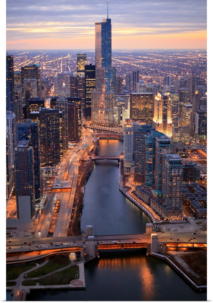 <p>Vertical panoramic photograph of city skyline at dusk. Building lights are shining and there is a river running through the city's center.</p>