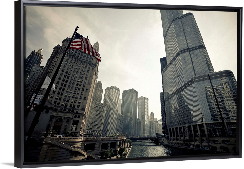 <p>The sun rises over the glorious Chicago river. The American flag is seen braving waving in the foreground. An overall essence of hope triumph is captured.</p>