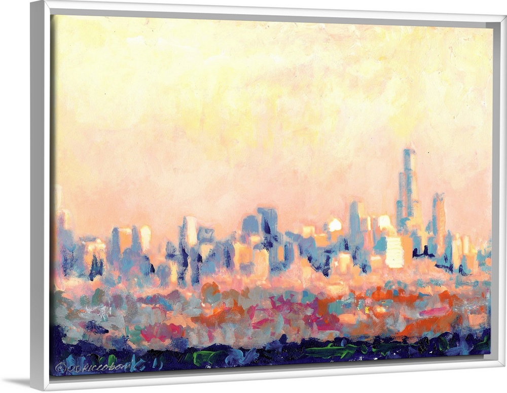<p>Chicago Pink, Abstract Impressionism by RD Riccoboni. Inspired by the view as the sun set to the west and the light reflected off the skyline to the east of the urban metropolis from a flight into the windy city while traveling across country. Abstract Impressionist style city painting of Chicago Skyline at dusk in soft pink, orange, blue, grey and red dominate the palette in this urban cityscape picture of Chicago Illinois.</p>