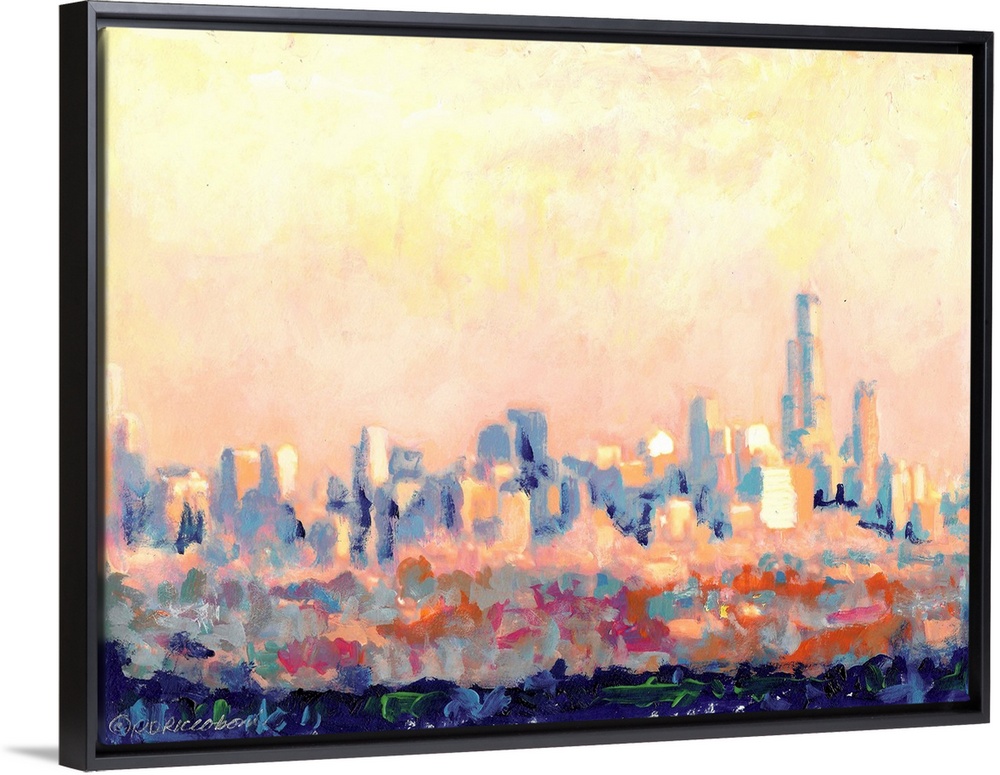 <p>Chicago Pink, Abstract Impressionism by RD Riccoboni. Inspired by the view as the sun set to the west and the light reflected off the skyline to the east of the urban metropolis from a flight into the windy city while traveling across country. Abstract Impressionist style city painting of Chicago Skyline at dusk in soft pink, orange, blue, grey and red dominate the palette in this urban cityscape picture of Chicago Illinois.</p>