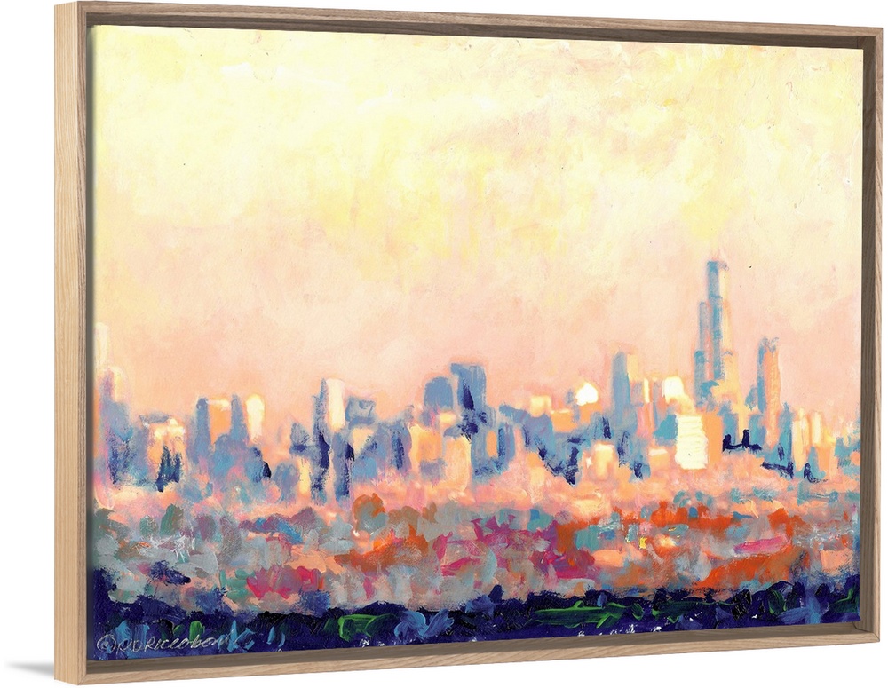 <p>Chicago Pink, Abstract Impressionism by RD Riccoboni. Inspired by the view as the sun set to the west and the light reflected off the skyline to the east of the urban metropolis from a flight into the windy city while traveling across country. Abstract Impressionist style city painting of Chicago Skyline at dusk in soft pink, orange, blue, grey and red dominate the palette in this urban cityscape picture of Chicago Illinois.</p>