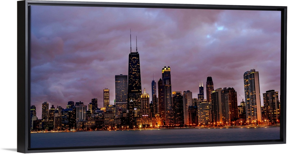 <p>Panoramic Photo of Chicago skyline at night under dramatic clouds.</p>