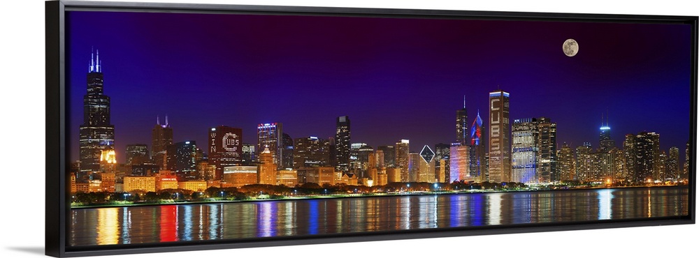 <p>Chicago skyline with Cubs World Series lights night, Moonrise, Lake Michigan, Chicago, Cook County, Illinois, USA.</p>