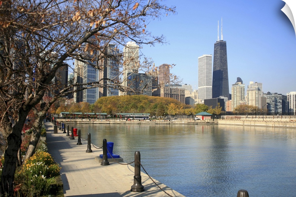 <p>Chicago Skyline with the Hancock Building, Lake Michigan, Chicago, Illinois, USA.Architecture, Canal, Travel Destinations, Outdoors, Skyline, Modern, Tree, Clear Sky, Day, Illinois, Chicago, Hancock Building, Lake Michigan, Skyscraper, Downtown District, No People, Building Exterior, Embankment, Boardwalk</p>