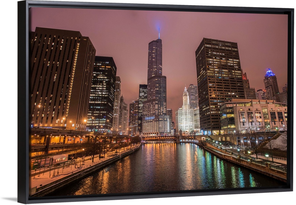 <p>Photo of tall buildings in the city of Chicago illuminated at dusk and reflected in the Chicago River.</p>