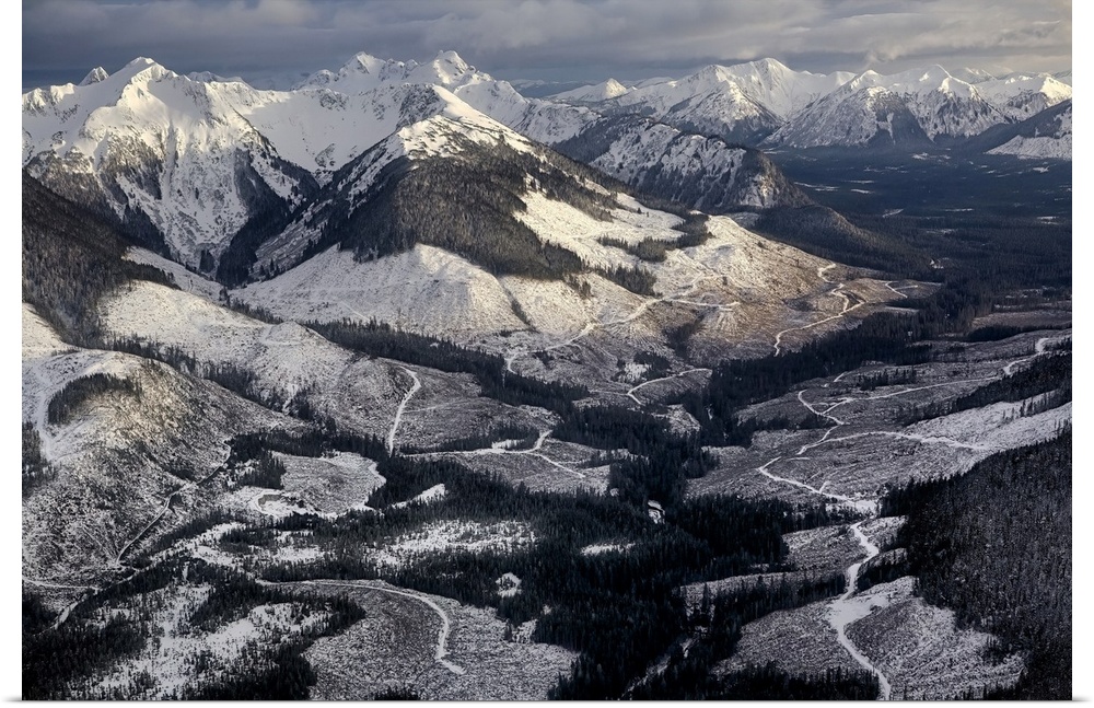 <p>More than 5,000 miles of roads are carved into the remote landscape to clear-cut large swatches of forests on Chichagof Island. An aerial picture after a winter snow reveals the patchwork on lower reaches of the mountains where logging traditionally occurs; Chichagof Island, Tongass National Forest, Southeast Alaska, Alaska, United States of America</p>