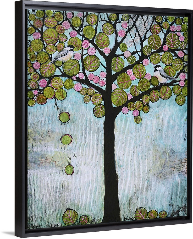 <p>Lighthearted contemporary painting of a tree with birds perched on the on the branches.</p>