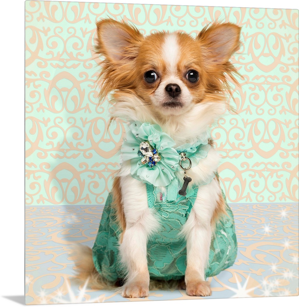 <p>Chihuahua wearing a green dress, sitting on fancy background</p>