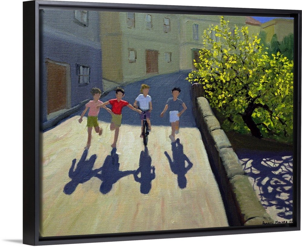<p>Horizontal painting on a big canvas of three children running alongside one that is on a bicycle, down a steep roadway next to a row of buildings in Lesbos, Greece.</p>