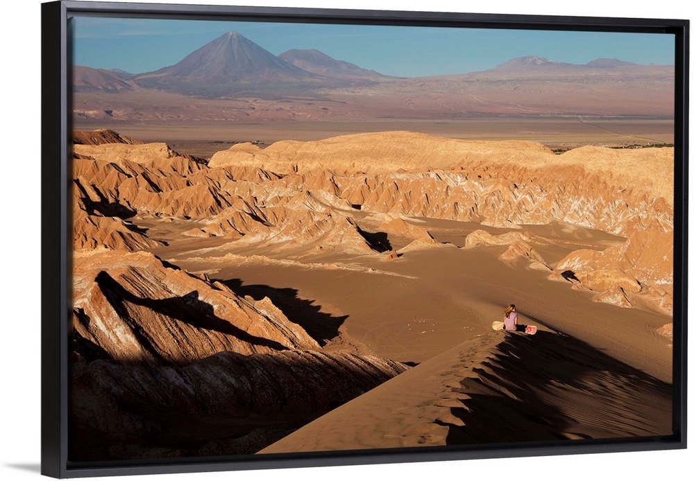 <p>Chile, Antofagasta, Atacama Desert, San Pedro de Atacama, Sand surfing in the Death Valley with Licancabur volcano in the background.</p>