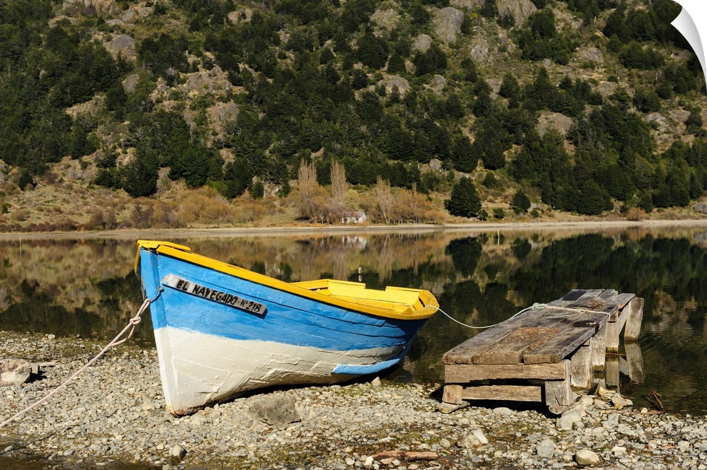 <p>Chile, Aysen, Bertrand, Baker River. Fishing boat on the shore of Lago Bertrand.</p>