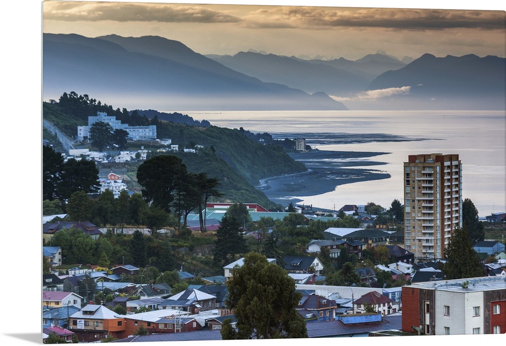 <p>Chile, Los Lagos Region, Puerto Montt, elevated town view, dawn</p>
