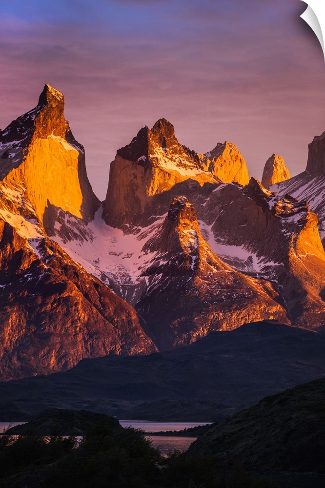 <p>Chile, Torres del Paine, Magallanes Province. Sunrise over the peaks of Cuernos del Paine. .</p>