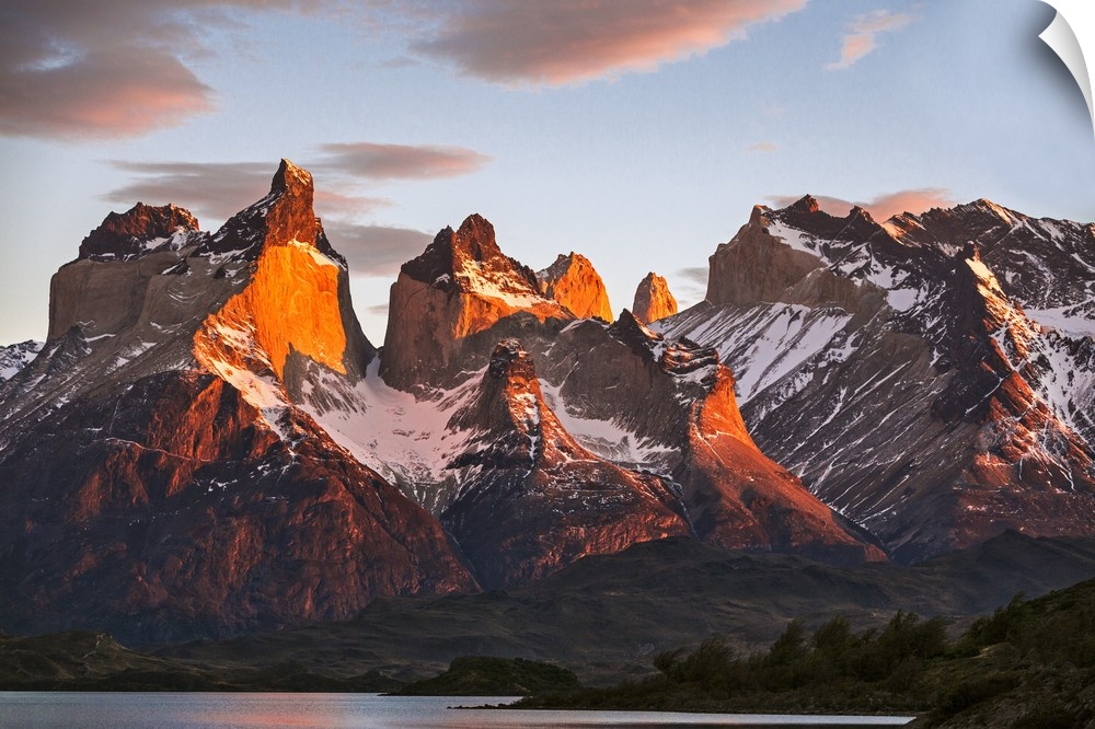 <p>Chile, Torres del Paine, Magallanes Province. Sunrise over the peaks of Cuernos del Paine. .</p>