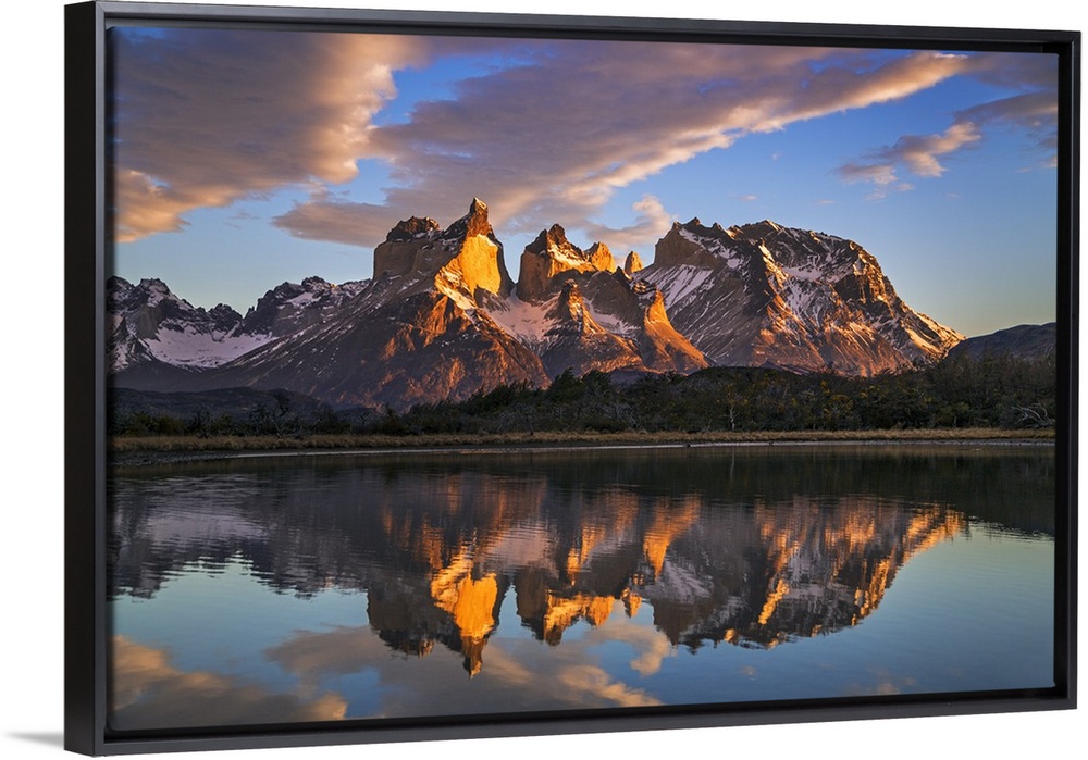 <p>Chile, Torres del Paine, Magallanes Province. Sunrise over Torres del Paine reflected in the waters of Lake Pehoe in the foreground. .</p>