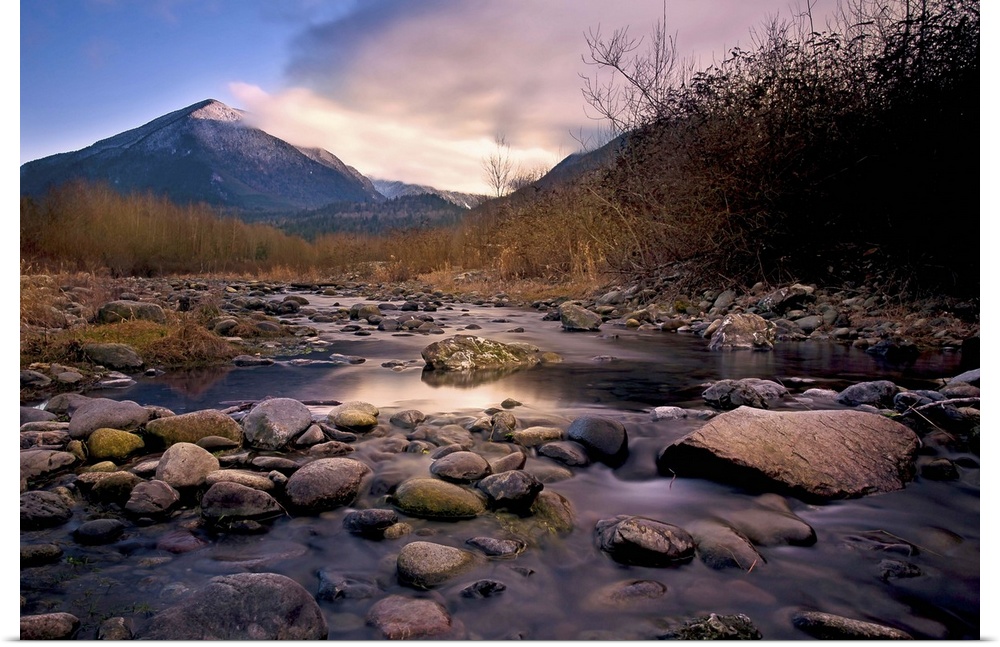 <p>A rocky river overlooking a mountain at sunset.</p>