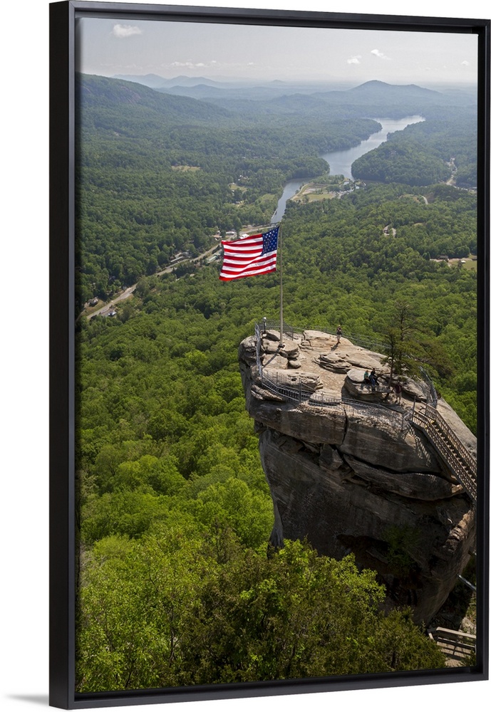 <p>Chimney Rock viewing platform. Landscape and viewing platform on Chimney Rock, a 535-million-year-old rock spire and tourist attraction in Chimney Rock State Park, North Carolina, USA. The viewing platform looks out over the surrounding area and Lake Lure. Photographed in April 2016.</p>