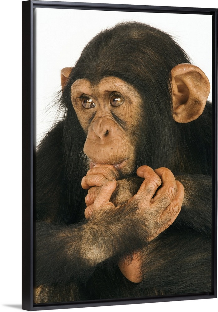 <p>Chimpanzee (Pan troglodytes). Young playfull chimp. Studio shot against white background.</p>