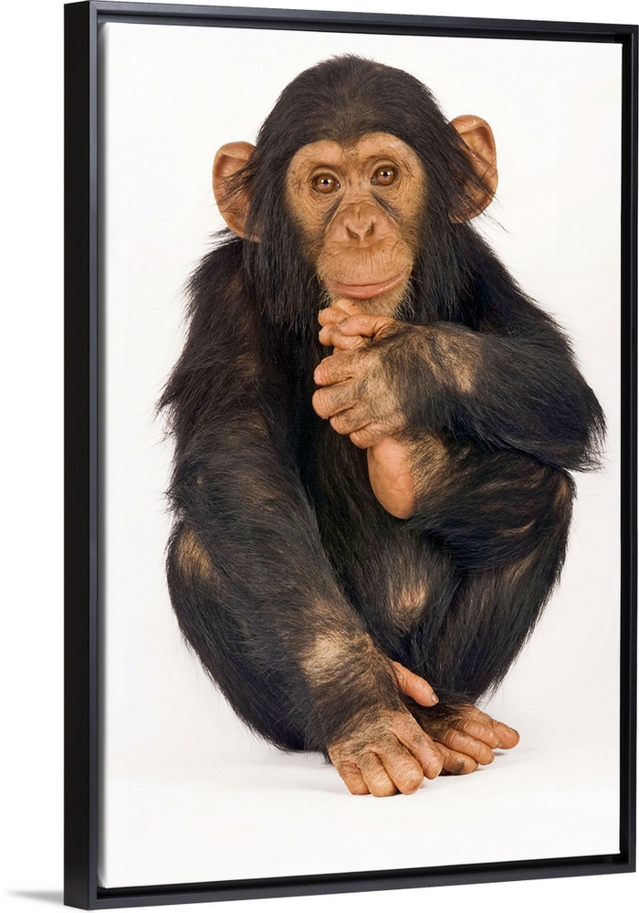 <p>Chimpanzee (Pan troglodytes). Young playfull chimp. Studio shot against white background.</p>