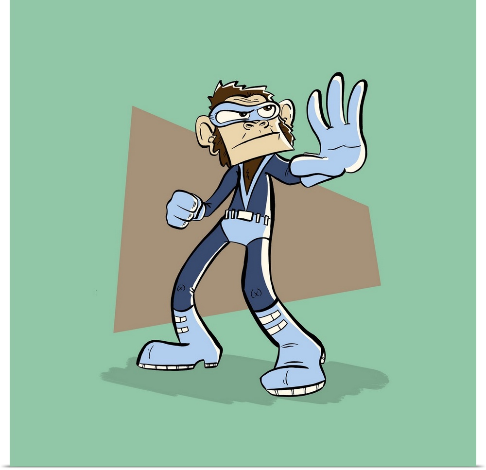 <p>A chimpanzee superhero wearing a costume and mask, striking a pose.</p>