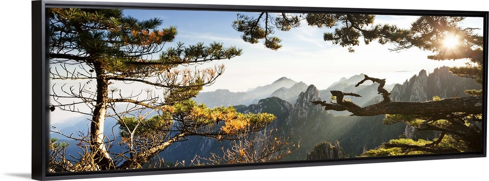 <p>China, Anhui, Huangshan, Sunrise over the pine trees of the North sea (Beihai).</p>