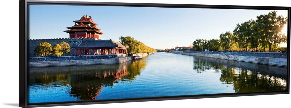 <p>China, Beijing, Forbidden City, Corner tower and the walls surrounded by water at sunset.</p>