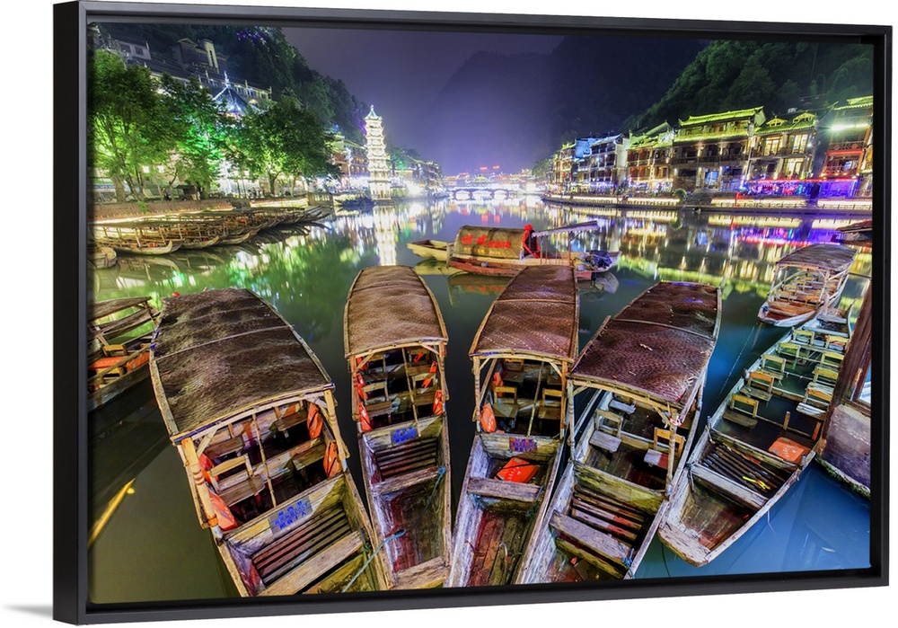 <p>China, Hunan province, Fenghuang, traditional bamboo rafts and riverside houses reflecting in the river by night.</p>