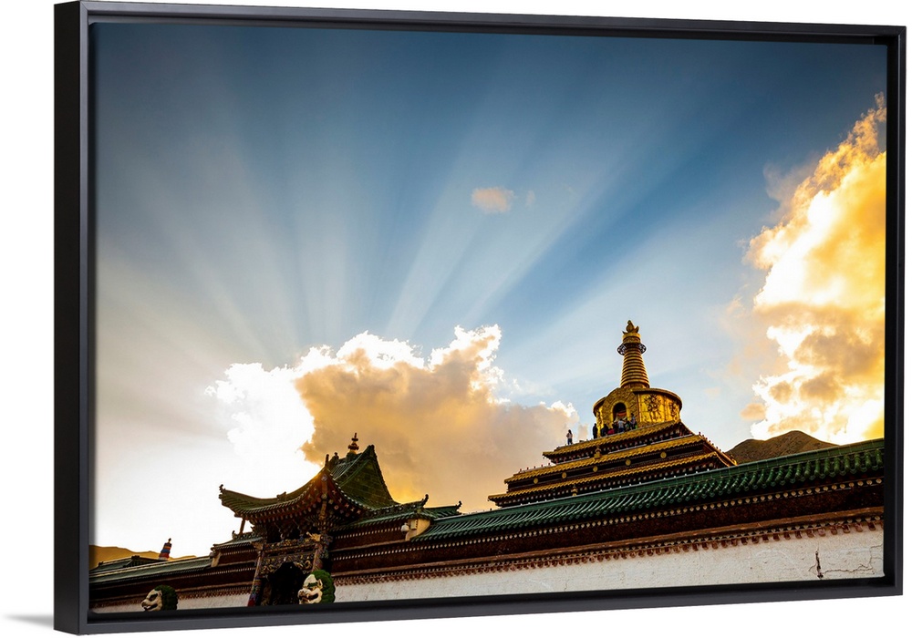 <p>China, Gansu, Xiahe, Ray of sunlight over the Gong Tang pagoda of Labrang Monastery.</p>
