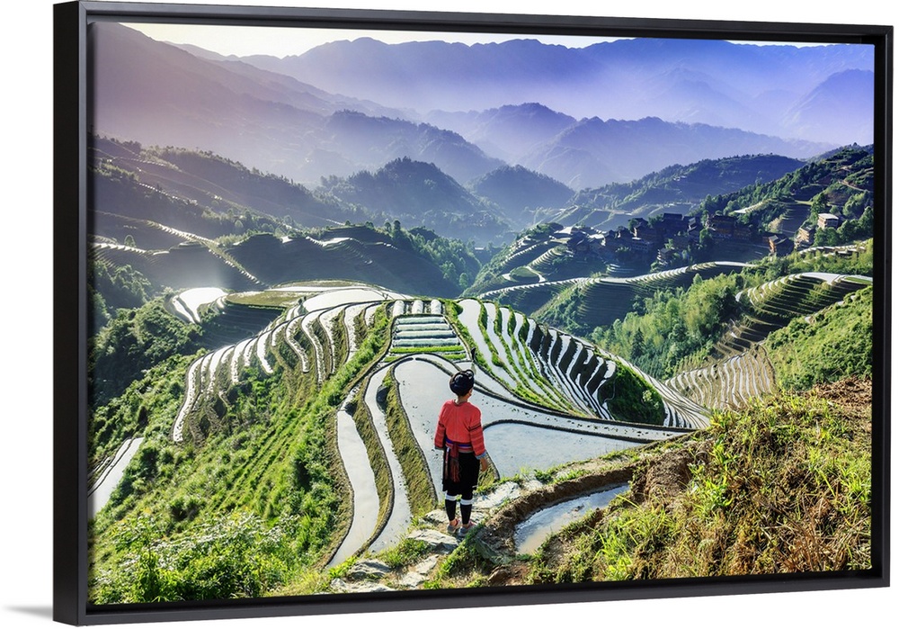 <p>China, Guangxi Province, Longsheng, a woman from a local ethnic minority famous for their very long hair at Long Ji rice terraces with Tiantou village in the background.</p>