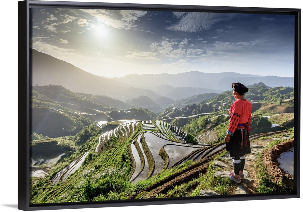 <p>China, Guangxi Province, Longsheng, a woman from a local ethnic minority famous for their very long hair at Long Ji rice terraces with Tiantou village in the background.</p>