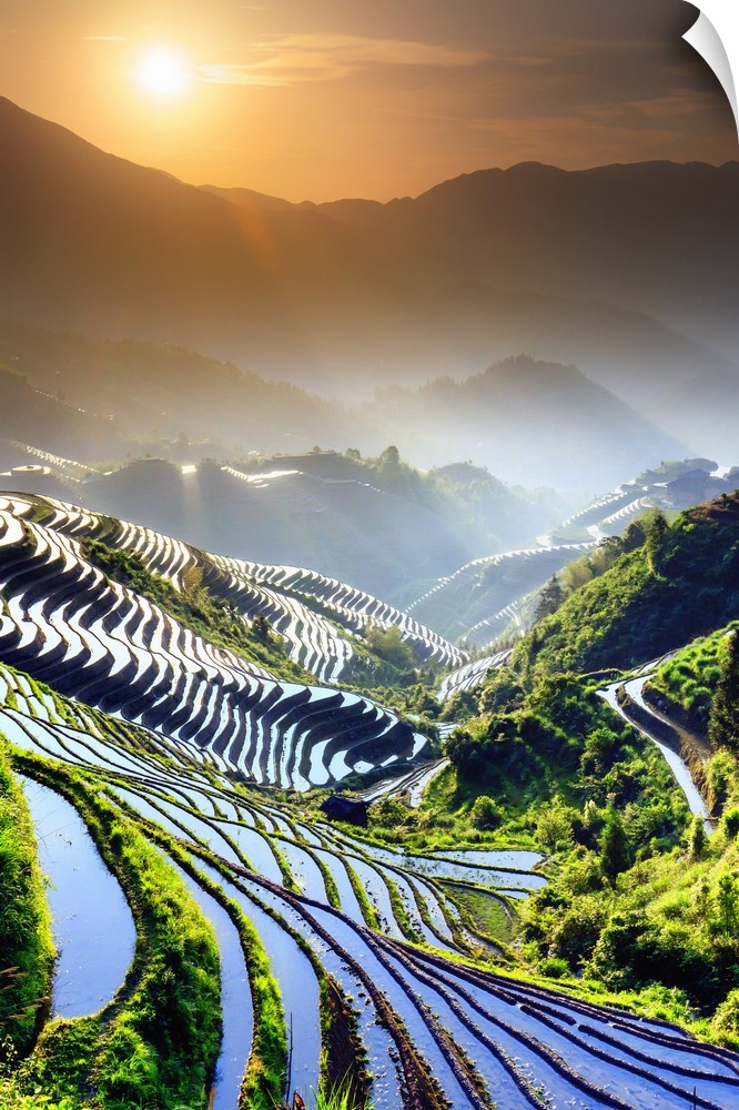 <p>China, Guangxi Province, Longsheng, Long Ji rice terrace filled with water in the morning with Tiantou village in the background.</p>