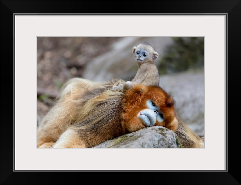 <p>China, Shaanxi Province, Foping National Nature Reserve. Golden snub-nosed monkey (Rhinopithecus roxellana, endangered). Newborn baby golden snub-nosed monkey less than 3 months old sitting on its father's back.</p>