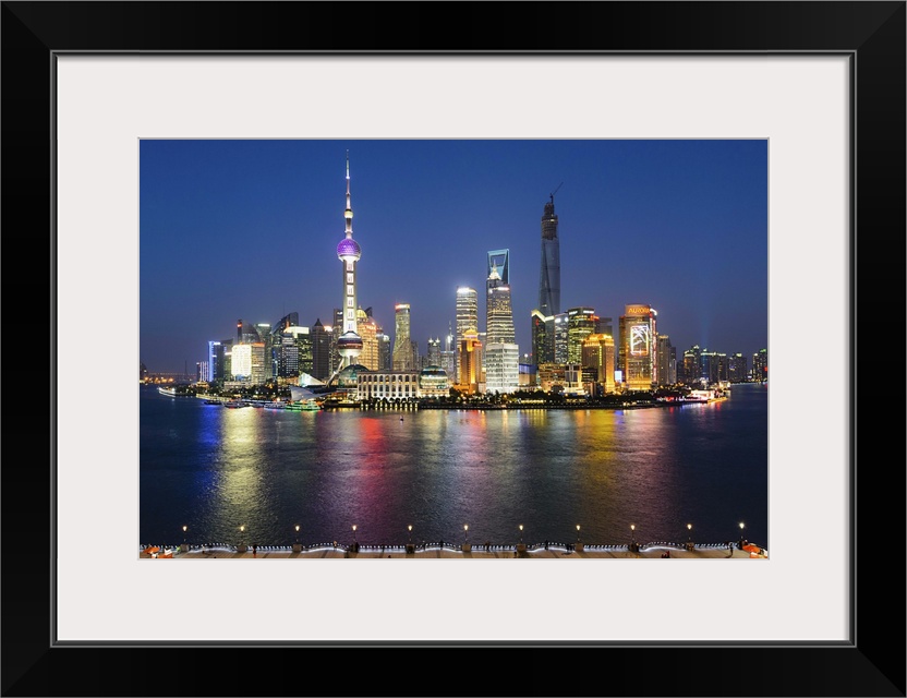 <p>China, Shanghai, Pudong, Oriental Pearl Tower, Lujiazui Financial District skyline with Jinmao Tower, Shanghai World Financial Centre and Shanghai Tower illuminated at night.</p>